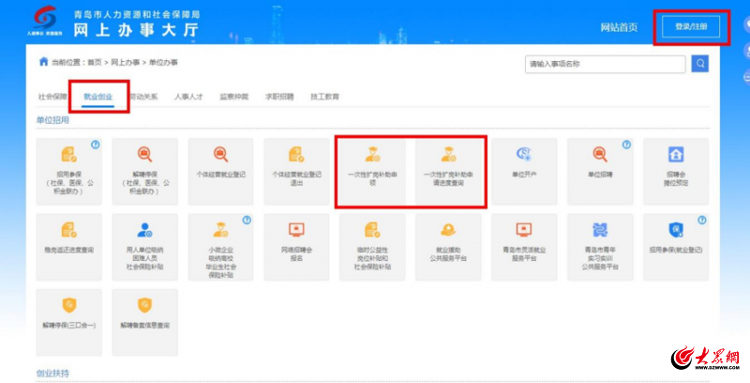申领企业可通过青岛市人力资源和社会保障局官网(http://hrss.qingdao.gov.cn),首页“就业创业”—“查看更多”—“单位招用”一“一次性扩岗补助申领”模块进行线上申领。
