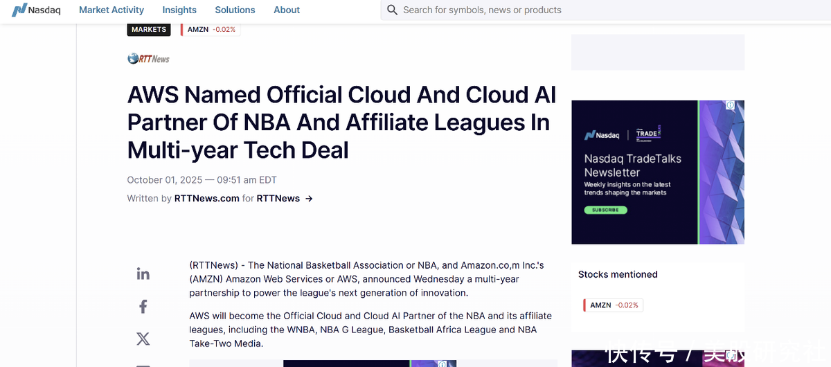 当市场还在纠结于云基础设施的季度增长率时,亚马逊 (NASDAQ: AMZN) 已经悄然为旗下的亚马逊云科技业务找到了一个新的、极具想象力的增长引擎——体育竞技。就在昨晚,纳斯达克官网消息炒股配资之家,NBA宣布与亚马逊云科技达成多年合作伙伴关系,共同推动NBA的下一代创新。