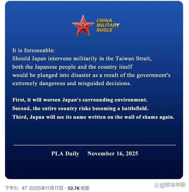 结果没料到,高市面对中方,连一个回合都坚持不到,就败下阵来。中方警告一出,日本旅游和消费股立时下跌,中国多家旅行社接到不少赴日团队游退订要求,还有旅行社暂停销售日本游配套。中国军号的发文也很及时,也很必要,告诉日本,若武力介入台湾问题,战争绝不会止于台海,必须做好本土沦为战场的准备。